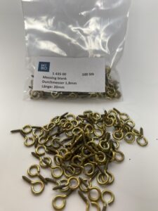 | 1 435 00 | Ringschräubchen für Ventilanhänger | 1,8mm, 20mm lang mit offenem Auge Messing vernickelt 100 Stk | EUR 22,50 |